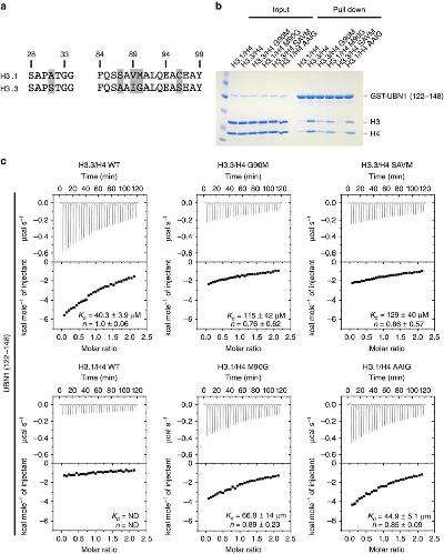Figure 1. A region of UBN1 containing the Hpc2-related domain (HRD) is able to specifically bind to histone H3.3.(a) Sequence alignment comparing two highly conserved domains in Homo sapiens UBN1, Drosophila melanogaster Yemanuclein and Saccharomyces cerevisiae Hpc2. (b) GST pull-down histone-binding assay. Binding to H3.3/H4 and H3.1/H4 is tested separately in a single input H3/H4 pull-down (left), and in competition by subjecting an equimolar mixture of H3/H4 and His-H3/His-H4 to pull down (right). The H3.3-specific binding activity of GST-UBN1(41–175)/HIRA(1–405) (top), GST-UBN1(92–175) (middle) and free GST (bottom) is compared. (c) Isothermal titration calorimetry was used to quantitatively compare UBN1(92–175) binding with H3.3/H4 (left) and H3.1/H4 (right), ± values represent the standard error of the ITC fit using Origin 7.0. ND, not determined.
