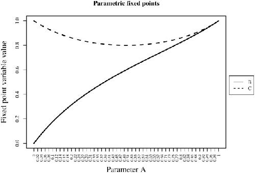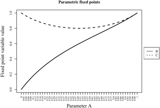 Fig 2. Parametric fixed points.An example of parametric dependency of fixed points is shown. Table 1 shows the BNE.