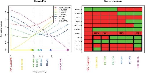 Fig 4. Phenotypes predicted by the BNE.The phenotype profile used for the mapping is based on the 11 genes present in both the Boolean model and the Xenopus analysis. The figure in the left panel shows the distance curves for the nearest phenotypes and fixed points. The x-axis denotes the values of the parameter exogen_canWnt_I and the phenotypes to which the fixed points were mapped. The y-axis shows the actual distance. The phenotypes are ordered by increasing exogen_canWnt_I expression propensity (right panel). Activated genes are shown in green and deactivated genes are shown in red. The framed box shows the gene expression propensity pattern for the four genes Isl1, Nkx2.5, Tbx1, and Tbx5 that corresponds to the the RT–PCR phenotypes of the FHF and SHF from the Fig 3. The FHF_BOOL and SHF_BOOL phenotypes correspond to the phenotypes found in the Boolean model [16]. The SHF1 phenotype is split in three sub-phenotypes PH-1076, PH-564, and PH-692 that differ by the gene expression propensity of canWnt, Bmp2, and Fgf8. The expression of the Fgf8 gene was not reported in Xenopus. Its activation pattern is a prediction of the BNE.