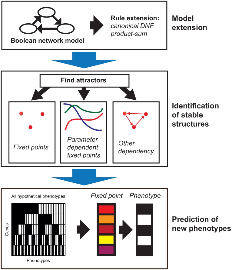 Fig 1. Phenotype analysis using the Boolean Network Extension (BNE).The application of the BNE to a given Boolean network (BN) can be divided into three basic steps: Model extension (top), identification of stable structures (middle) and mapping to phenotypes (bottom). In the model extension step (top) the rules of the BN are transformed to the rules of the BNE by converting the rules of the BN to canonical disjunctive normal form (DNF) and then to product-sum fuzzy logic (DNF product-sum extension, details see section Extension of Boolean networks). In the âidentification of stable structuresâ-step (middle) the extended BNE is simulated for a large number of random inputs. The resulting approximated attractors can either be fixed points approximated by point clouds, fixed points depending on one or multiple parameters or different dependencies. Finally, new phenotypes are identified step (bottom) by mapping the fixed points to their nearest hypothetical phenotype.