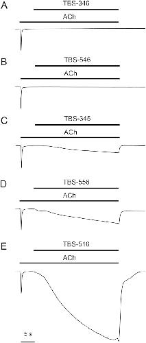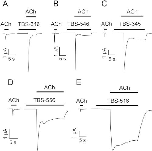 Fig. 2. Potentiation of responses to acetylcholine on wild-type α7 nAChRs by TBS compounds. Representative traces are shown illustrating responses to acetylcholine (100 μM) together with responses from the same oocyte to acetylcholine (100 μM) after pre- and co-application of 10 μM TBS-346 (A), TBS-546 (B), TBS-345 (C), TBS-556 (D) or TBS-516 (E).