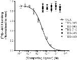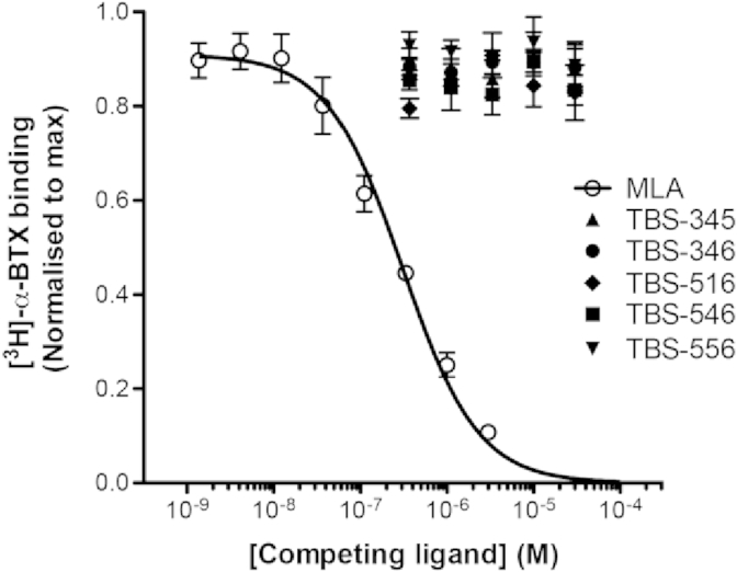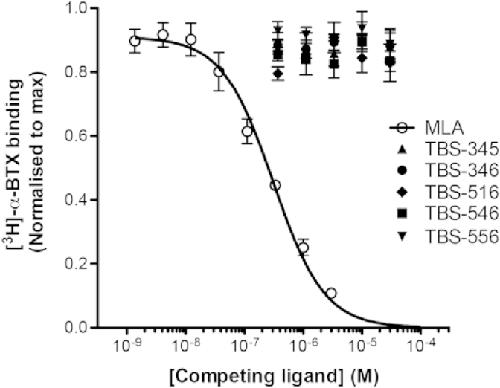 Fig. 4. Competition radioligand binding. Equilibrium radioligand binding was performed with [3H]-α-bungarotoxin (1 nM) with mammalian tsA201 cells transiently transfected with human α7 nAChR subunit and with human RIC-3 cDNAs (1:1 ratio). TBS-345, TBS-346, TBS-516, TBS-546 and TBS-556 caused no significant displacement of [3H]-α-bungarotoxin binding, whereas MLA caused complete displacement of specific radioligand binding. Data points are means of triplicate samples (± SD) from a single experiment, and data are typical of three independent experiments.