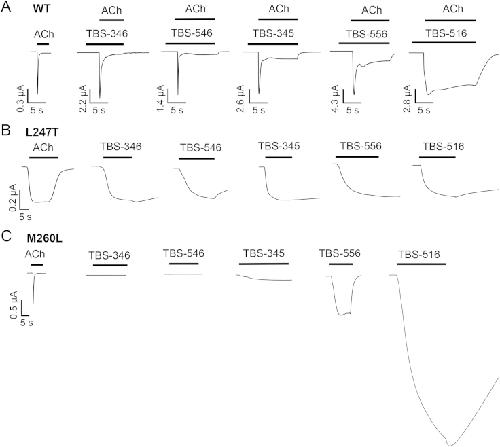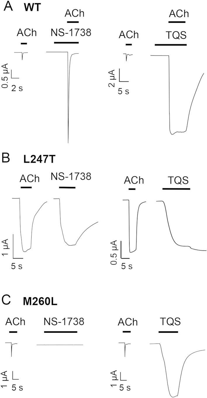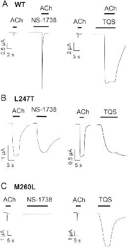 Fig. 6. The influence of a type I (NS-1738) and a type II PAM (TQS) on wild-type and mutated (L247T or M260L) α7 nAChRs. A) Representative traces illustrating responses with wild-type α7 nAChRs to acetylcholine (100 μM) and after the pre- and co-application of either NS-1738 (10 μM; Left pair of traces) or TQS (30 μM; Right). B) Representative traces illustrating responses with mutated (L247T) α7 nAChRs to acetylcholine (10 μM) and to NS-1738 (10 μM; Left) or TQS (30 μM; Right). C) Representative traces illustrating responses with mutated (M260L) α7 nAChRs to acetylcholine (100 μM) and NS-1738 (10 μM; Left) or TQS (30 μM; Right).