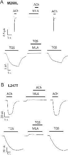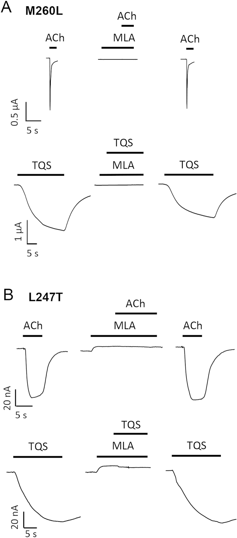 Fig. 8. Antagonism of agonist responses to acetylcholine and TQS responses on M260L and L247T α7 nAChRs. A) Representative traces with M260L α7 nAChRs illustrating initial agonist responses with acetylcholine (1 mM) or TQS (10 μM) (left), antagonism by pre- and co-application of MLA (1 μM) (middle) and recovery in the absence of MLA (right). B) Representative traces with L247T α7 nAChRs illustrating initial agonist responses with acetylcholine (10 μM) or TQS (3 μM) (left), antagonism by pre- and co-application of MLA (1 μM) (middle) and recovery in the absence of MLA (right).