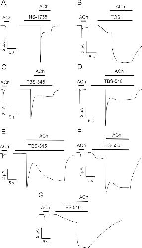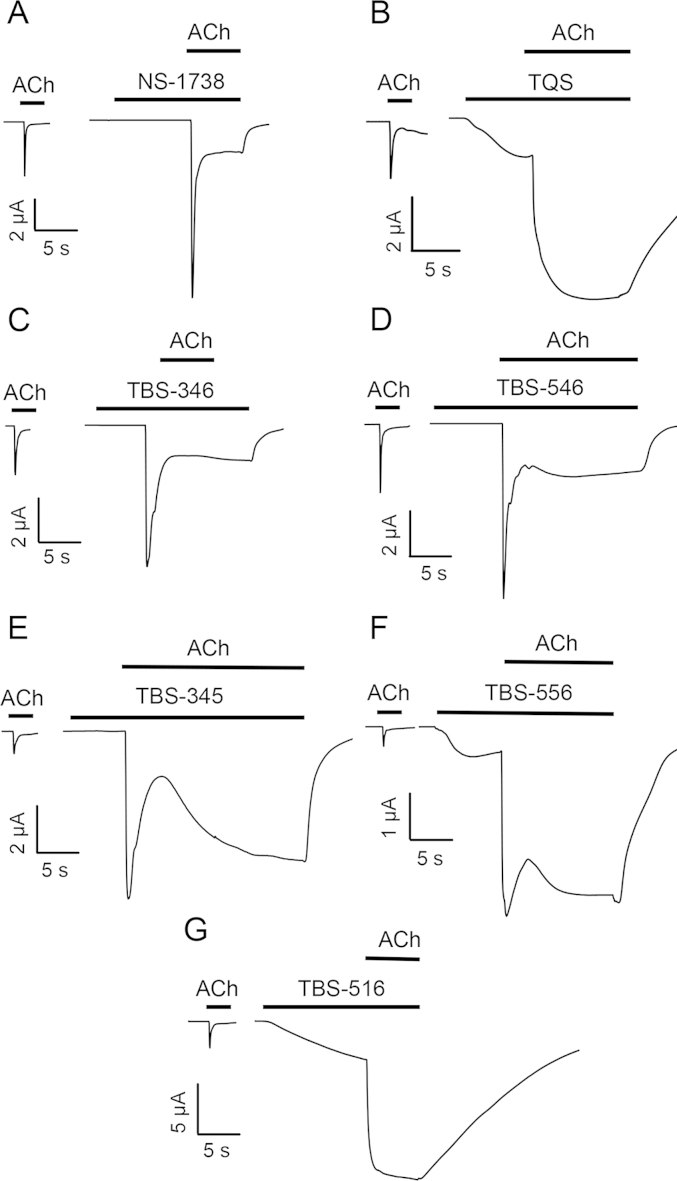 Fig. 9. Potentiation of acetylcholine responses by allosteric modulators on M260L α7 nAChRs. Representative traces are shown illustrating responses to acetylcholine (100 μM) (left) together with responses from the same oocyte after pre- and co-application of an allosteric modulator (10 μM) (right). Representative traces are shown for NS-1738 (A), TQS (B), TBS-346 (C), TBS-546 (D), TBS-345 (E), TBS-556 (F) and TBS-516 (G).