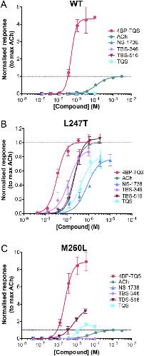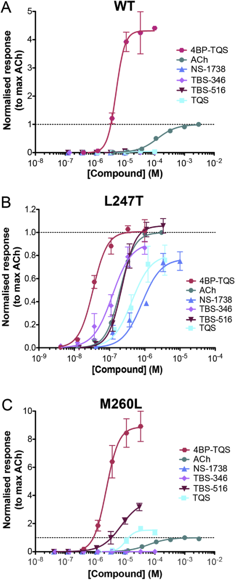 Fig. 10. Concentration–response curves for the wild-type and mutated α7 nAChRs. Data are shown from wild-type α7 nAChRs (A), α7 nAChRs containing the L247T (9′) mutation (B) and α7 nAChRs containing the M260L (22′) mutation (C). Data are presented for a range of concentrations of acetylcholine (circles), the allosteric agonist 4BP-TQS (hexagons), the type II PAMs, TQS (squares) and TBS-516 (inverted triangles), and the type I PAMs, NS-1738 (triangles) and TBS-346 (diamonds). Data are means ± SEM of at least three independent experiments and are normalised to the maximum acetylcholine response.