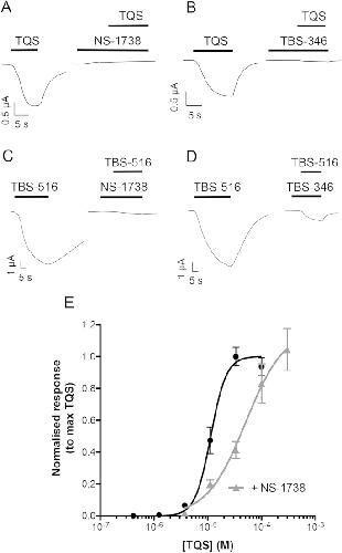 Fig. 11. Type I PAMs block agonist activity of TQS and TBS-516 on α7 nAChRs containing the M260L mutation. Representative traces are shown, obtained by two-electrode voltage-clamp recording in oocytes expressing α7 nAChRs containing the M260L mutation, in which a type I PAM (NS-1738 or TBS-346) was pre applied for 10 s and then co-applied with a type II PAM (TQS or TBS-516) (A–D). A) NS-1738 (10 μM) completely blocked responses to TQS (10 μM). B) TBS-346 (10 μM) blocked responses to TQS (10 μM) by 95.7 ± 1.1% (n = 3). C) NS-1738 (10 μM) blocked responses to TBS-516 (10 μM) by 92.7 ± 2.3% (n = 3). D) TBS-346 (10 μM) blocked responses to TBS-516 (10 μM) by 83.4 ± 4.1% (n = 3). E) The agonist concentration-response curve for TQS on α7 nAChRs containing the M260L mutation was shifted to the right in the presence of NS-1738 (2 μM, pre-applied for 10 s and then co-applied with TQS). The antagonism by NS-1738 was surmountable at high concentrations of TQS.