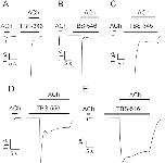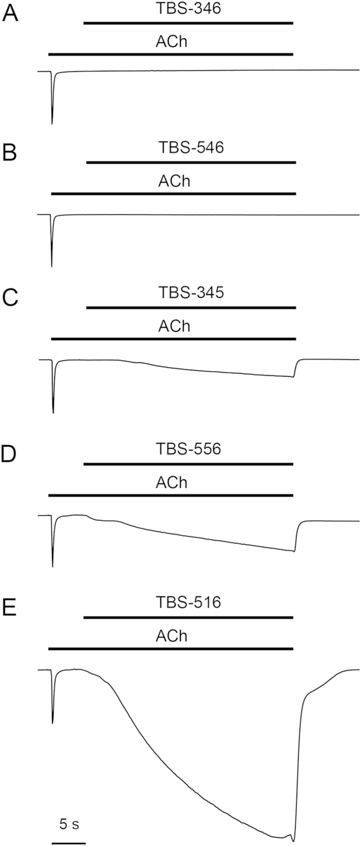 Fig. 3. Influence of TBS compounds on the recovery of α7 nAChRs from desensitisation. Representative traces showing prolonged exposure of α7 nAChRs to acetylcholine (100 μM), causing activation, followed by rapid desensitisation. In the continued presence of acetylcholine, application of (A) TBS-346 (10 μM) and (B) TBS-546 (10 μM) does not result in reactivation of the receptor. However, application of (C) TBS-345 (10 μM), (D) TBS-556 (10 μM) and (E) TBS-516 (10 μM) results in reactivation of desensitised receptors. Traces have been scaled to their response to acetylcholine.