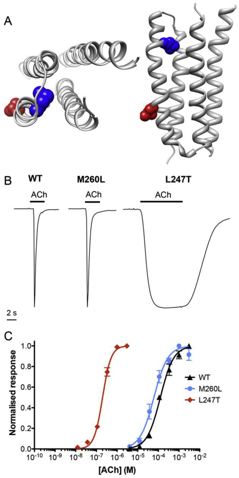 Fig. 5. The influence of α7 nAChR mutations (L247T and M260L) on activation by acetylcholine. A) The location of L247T (9′) and M260L (22′) mutations in the α7 nAChR subunit transmembrane (TM2) domain. The transmembrane region of an α7 nAChR subunit homology model (Young et al., 2008) is shown viewed from the top (left hand image) and from the side (right hand image). The α-helical transmembrane regions are illustrated as ribbon structures with the side chains of the two mutated amino acids shown as space-filling models (L247 in red and M260 in blue). B) Representative traces are shown illustrating responses to maximal concentrations of acetylcholine on human wild-type (WT) α7 nAChRs and α7 nAChRs containing the M260L mutation (M260L) and the L247T mutation (L247T). Acetylcholine concentrations: 1 mM for WT and M260L and 10 μM for L247T. C) Acetylcholine concentration-response data are presented for wild-type α7 nAChRs (triangles) and for α7 nAChRs containing either the M260L mutation (circles) or the L247T mutation (diamonds). Data are means ± SEM of at least three independent experiments and are normalised to the respective maximum response obtained with each nAChR variant. (For interpretation of the references to colour in this figure legend, the reader is referred to the web version of this article.)