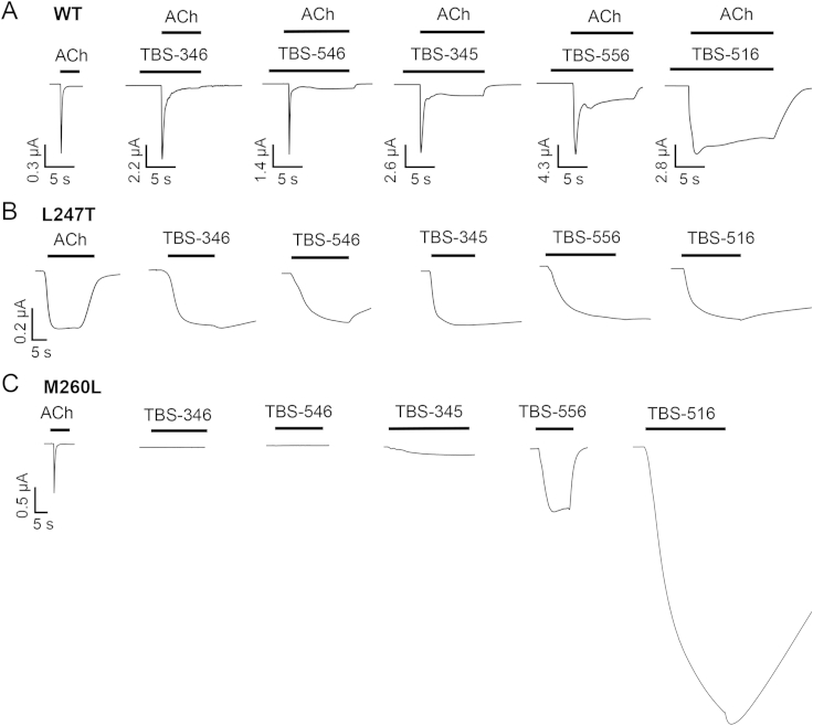 Fig. 7. Potentiation and agonist effects of TBS compounds on wild-type and mutated α7 nAChRs. A) Representative traces are shown illustrating responses from wild-type α7 nAChRs to acetylcholine (100 μM), together with responses to acetylcholine (100 μM) after pre- and co-application of TBS compounds (10 μM). To illustrate differences in the rate of desensitsation, all responses on wild-type α7 nAChRs have been normalised to their peak response. B) Representative traces are shown illustrating agonist responses from α7 nAChRs containing the L247T (9′) mutation to either acetylcholine (10 μM) or TBS compounds (10 μM). C) Representative traces are shown illustrating agonist responses from α7 nAChRs containing the M260L (22′) mutation to either acetylcholine (100 μM) or TBS compounds (10 μM).