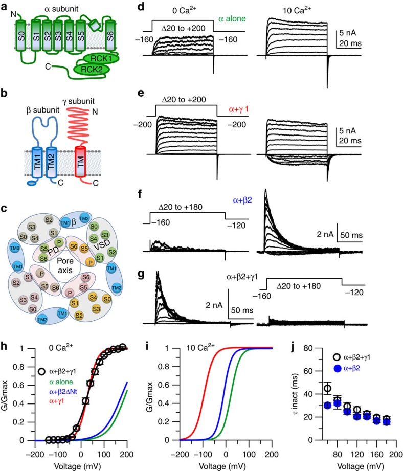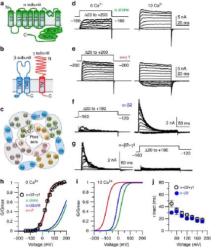 n=5); α+γ1 (Vh=−95.1±3.9 mV, z=1.4±0.05 e0, n=8). (j) Averages of τinact at voltages up to +180 for α+β2+γ1 at 0 Ca2+ (n=9) and α+β2 at 10 Ca2+ (n=6), respectively. All errors are s.e.m.