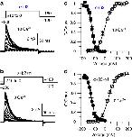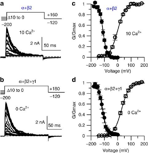Figure 2. The voltage dependence of the fraction of channels available to activate also reflects the coassembly of β2- and γ1-subunits in the same channels.(a–b) Examples of the fractional availability of channels as function of the conditioning potential from oocytes injected with α+β2 (10 μM Ca2+) or α+β2+γ1 (0 Ca2+), respectively. Currents were evoked by the indicated protocols using conditioning potentials of 100 ms duration. (c–d) Curves of activation (open symbols) and fractional availability (filled symbols) as function of voltage obtained at 10 μM of Ca2+ for α+β2 or 0 Ca2+ for α+β2+γ1 channels, respectively, are plotted together. G–V fits to single Boltzmann distributions yielded the following parameters: α+β2 SS-inactivation (Vh=−110.8±2.3 mV, z=1.81±0.11 e0, n=7) α+β2-activation (Vh=−6.7±2.4 mV, z=0.96±0.31 e0, n=6); α+β2+γ1-SS-inactivation (Vh=−113.5±5.3 mV, z=1.56±0.12 e0, n=4), α+β2+γ1-activation (also shown in Fig. 1h). All errors are s.e.m.
