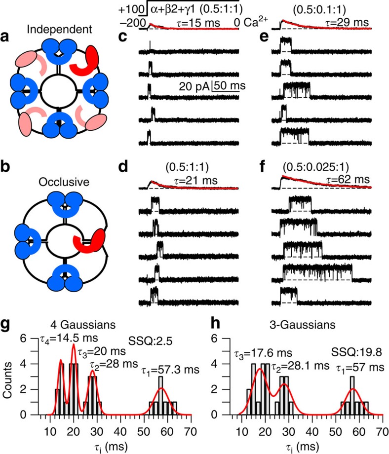 Figure 3. Single α+β2+γ1 channels simultaneously exhibit the maximal γ1-induced effect and up to four β2-subunits.(a–b) Cartoons representing two distinctive assembly models: where α, white; β2, blue; γ1, red. (c–f) Representative single channels obtained from various α:β2:γ1 injection ratios (given above each set of traces). For each example, five consecutive traces of current recorded at 0 Ca2+ are shown together with the ensemble current average from 100 total traces recorded in the same conditions. Red lines: fit of a single exponential with the indicated τinact. (g–h) Grey bars represent the distribution of τinact from 31 single-channels (bin size: 2 ms). Red lines represent fits of the binned data to four- or three-component Gaussian distributions, respectively, both with the s.d. (sn) constrained such that s1≥