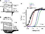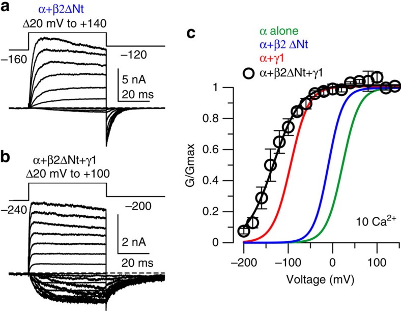 Figure 4. γ1 and β2 induced gating shifts are largely additive.(a–b) Currents arising from coexpression of α+β2-inactivation removed (β2ΔNt) (a) or α+β2ΔNt+γ1 (b) with 10 μM Ca2+. (c) Comparison of the gating shift obtained by β2 with or without the γ1 expression. β2 produces an approximately 30–35 mV shift with or without γ1. With 10 μM Ca2+, Vh for (α alone)=+22.6±3.4 mV, (α+γ1)=−95.1±3.9 mV, (α+β2ΔNt)=−9.2±4.4 mV and (α+β2ΔNt+γ1)=−134.7±8.8 mV (n=5); ΔV(β2)=31.8, ΔV(γ1)=117.7, ΔV(β2ΔNt+γ1)=157.3. All errors are s.e.m.
