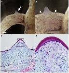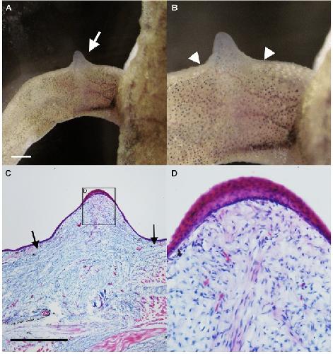 Figure 1. ALM blastema‐like formation (bump) in Xenopus laevis. (A, B) Nerve deviation to the skin wound resulted in induction of the bump. Arrow in A indicates the induced bump. Arrowheads in B indicate the border of the wounded skin. (C, D) Histological observations. (C) In the bump region, many mesenchymal cells can be observed. Arrows indicate the border of the dermal collagen layer. (D) Higher magnification of (C). The distal epithelium, which is expected to be an AEC, was thickened. Scale bars in (A) and (C) are 1 mm.