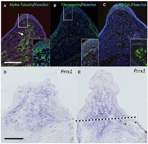 Figure 2. Gene expression pattern in the bump. (A) Neural tubulin (acetylated alpha‐tubulin) was visualized by immunofluorescence. The white arrow indicates the thick nerve bundle observed in the center of the bump. The deviated nerves abundantly penetrate into the overlying epithelium (inset). (B) One of the classical blastema marker genes, fibronectin, was investigated. The signal of fibronectin can be seen in the blastemal region and the epithelium−mesenchyme boundary shows intense fibronectin signal (inset). (C) Type II collagen expression. Type II collagen is a cartilage marker gene and negative in the bump. The inset shows the signal in the limb cartilage located in the proximal region as the positive control. (D, E) Prrx1 expression. Prrx1 can be seen in the blastemal mesenchyme in the ALM blastema (D) and the regular blastema in the amputated limb (E). The dotted line in (E) indicates the presumptive amputation plane. All conditions of the in situ hybridization were the same in (D) and (E). Scale bars in (A) and (D) are 0.5 mm.