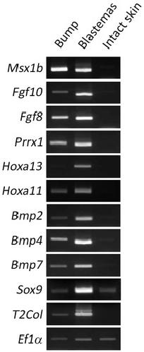 Figure 3. RT‐PCR analysis of the induced bump. Gene expression pattern was investigated by RT‐PCR. Samples were prepared from the induced bumps (2 weeks after the surgery), regular blastemas (MB; 2 weeks after amputation), and intact skin. Msx1b, Fgf10, Fgf8, and Prrx1 were positive in both the bump and the regular blastema, while they were negative in intact skin. Hoxa13 could not be detected in the bump but could be detected in the regular blastema. Bmp genes were also investigated by RT‐PCR. Bmp2, 4, and 7 were positive in both the bump and the regular blastema. Type II collagen and Sox9 were unexpectedly detectable in the bump, but the regular blastema showed much higher expression level. Ef1α was an internal control.