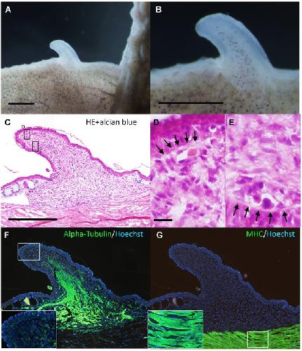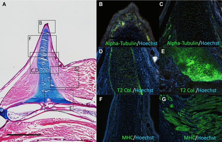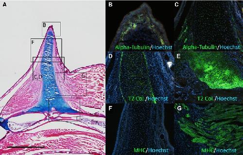 Figure 6. Section of the cartilaginous spike induction by deep wounding. (A) Histological observation. Alcian‐blue‐positive cartilage extends from the stylopod. (B, C) Acetylated alpha‐tubulin expression. (D, E) Type II collagen (T2 Col.) expression. (F, G) MHC expression. (B)−(G) are the boxed region of (A). The scale bar in (A) is 1 mm.
