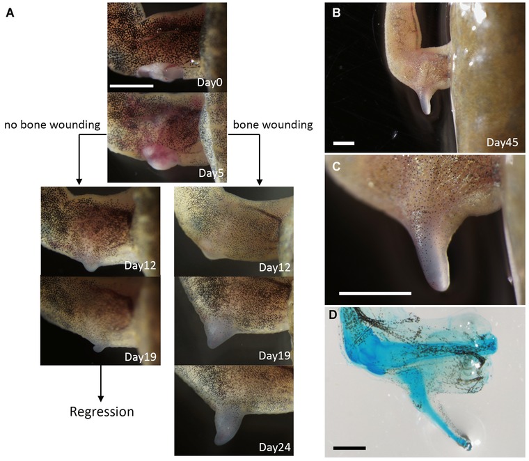 Figure 5. Cartilaginous spike induction by deep wounding. (A) Time course of the induced bump and spike induction. Skin wounding plus nerve deviation result in bump formation. In this case, a small bump can be seen within 12 days, but it starts regressing by day 19. On the other hand, when a deep wound is created enough to damage a stylopod bone, a cartilaginous spike can be observed. In this case, a relatively smaller bump can be observed at day 12. The induced bump kept growing up to spike formation. (B, C) Induced cartilaginous spike at day 45. (D) Whole‐mount Alcian blue staining. Scale bars in (A), (B), (C), and (D) are 2 mm.