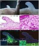 Figure 4. The induced bump did not contain cartilaginous cells. (A, B) Dorsal views of the day 20 bump. The induced bump stopped growing at day 20. (C) Histology of the bump. There are no Alcian‐blue‐positive cartilage cells in the mesenchymal region. (D, E) Higher magnification of the boxed regions in (C). Arrows in (D) and (E) indicate developing basal laminae. (F) Axons were visualized by immunofluorescence using anti‐acetylated alpha‐tubulin. In the distal region, highly innervated axon fibers in the epithelium were not observed in the day 20 bump (inset). (G) Myosin heavy chain (MHC) expression. There were no MHC‐positive myogenic cells in the bump. Scale bars in (A) and (B) are 1 mm. The scale bar in (C) is 500 μm. (C), (F), and (G) are the same magnification. The scale bar in (D) is 20 μm. (D) and (E) are the same magnification.