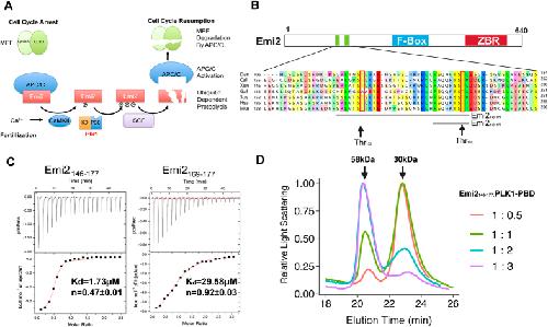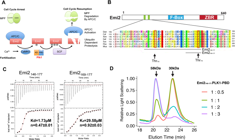 Figure 1. The presence of two Plk1-binding regions at the N terminus of mouse Emi2.(A) Diagram illustrating molecular events for cell cycle resumption after fertilization. In matured mammalian oocytes, maturation promoting factor (MPF) activity maintain high, because of ubiquitin ligase APC/C is inhibited by Emi2. After fertilization, increased Ca2+ activates calmodulin-dependent protein kinase II (CaMKII) and it phosphorylates N-terminal of Emi2. Plk1 is recruited by recognition of phosphothreonine residues in Emi2 by polo box domain (PBD) in Plk1 and subsequently phosphorylated Emi2 and phosphorylated Emi2 become substrate of another class of ubiquitin ligase, SCF and degradated by ubiquitin-proteasome. Activated APC-C can decrease MPF levels, therefore cell cycle for meiosis can be resumed. (B) Domain architecture of Emi2 and multiple-sequence alignment of Emi2 protein sequences from zebrafish (Danio rerio: Dan), Austrian ghostshark (Callorhinchus milii: Cal), Xenopus (Xenopus laevis: Xen), chicken (Gallus: Gal), Homo sapiens (hsa), pig (Sus scrofa: Sus), and mouse (Mus musculus: Mus). ZBR : Zinc Binding Region, Peptides containing a phosphorylated threonine (Emi2146–177 or Emi2169–177) are indicated with gray bars. Threonine residues that are subject to phosphorylation are indicated with a red box. (C) Binding affinity and binding stoichiometry of phosphorylated Emi2 peptides in relation to Plk1 Polo box domain (PBD). Isothermal titration calorimetry (ITC) with Emi2 peptides and Plk1-PBD was carried out as described in Materials and Methods. The dissociation constant (Kd) and the stoichiometric ratio of an Emi2 peptide to Plk1-PBD (n) is also shown. (D) Size exclusion chromatography coupled with multiangle light scattering (SEC-MALS) of PLK1-PBD·Emi2146–177 complexes. Plk1-PBD and the phosphorylated Emi2146–177 peptide were mixed at various stoichiometric ratios (molar ratio of Plk1-PBD1 to Emi2146–177: 1:1, 1:2, and 1:3, respectively) and were separated by size exclusion chromatography. The measured molecular weight of each peak is indicated with arrows.