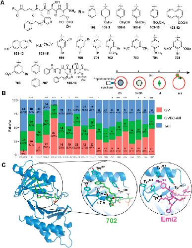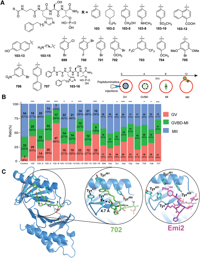 Figure 4. Peptidomimetics emulating the Plk1-PBD·Emi2 complex inhibit maturation of mouse oocytes.(A) Peptidomimetics resemble Plk1-PBD·Emi2 and bind to the Polo box domain (PBD) of Plk1. The compounds 103, 103-2, 103-5, 103-8, 103-10, 103-12, 103-13, 103-15 and 103-16 have been described previously34, and 699, 700, 701, 702, 703, 704, 705, 706 and 707 were characterized in this study. (B) Assessment of inhibitory activity of peptidomimetics on in vitro maturation (IVM) of mouse oocytes. Peptidomimetics were microinjected into immature mouse oocytes, which were subjected to IVM. GV: germinal vesicle, GVBD: germinal vesicle breakdown, MI: metaphase I, MII: metaphase II. Time (hr) required for maturation of an oocyte is indicated at the top of an arrow. Maturation status of mouse oocytes 12 hr after injection of a peptidomimetic was evaluated. At least three independent experiments were carried out and the ratios of oocytes at each developmental stage to all oocytes were plotted. Significant differences between the treatment groups and the control group are indicated by asterisk (***P ≤ 0.001, **P ≤ 0.01, *P ≤ 0.05). (C) Crystal structure of the Plk1-PBD·702 complex. PBD domain is shown in blue and peptidomimetic 702 is shown in green. In the enlarged circle, the structures of Emi2169–177 (violet) and peptidomimetic 702 (Green) are superimposed. Note that occupation of tyrosine-rich pockets by an alkylated imidazole ring (702) or a phenylalanine ring (Emi2169–177).