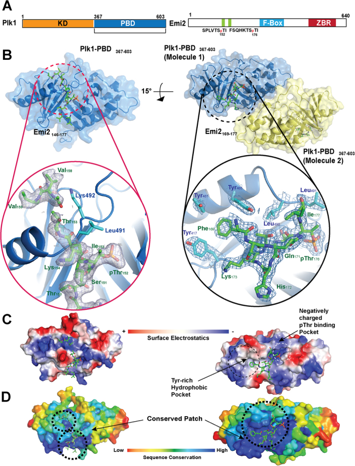 Figure 2. Crystal structure of Plk1 Polo box domain (PBD) and phosphorylated peptides derived from Emi2.(A) Domain organization of Plk1 and Emi2. Left: location of the kinase domain (KD) and the polo box domain (PBD) in Plk1 is indicated. Right: the location of the PBD-interacting part of Emi2 is highlighted in green. The phosphorylated threonine at amino acid positions 152 or 176 in Emi2 are also presented. ZBR: zinc-binding region. (B) Crystal structure of Plk1-PBD·Emi2146–177 (left) and Plk1-PBD·Emi2169–177. Plk1-PBD (blue) is shown as a cartoon Fig. and Emi2 fragments are shown as green sticks. Note that only electron density corresponding to amino acid residues 148–154 in Emi2146–177 is visible and was modeled. (C) Electrostatic surface representation (blue: positively charged, red: negatively charged) of Plk1-PBD bound to an Emi2-derived phosphopeptide. Left: Plk1-PBD·Emi2146–177, right: Plk1-PBD·Emi2169–177. (D) The surface of Plk1-PBD is colored according to residue conservation (conservation decreases from blue to red). Note that the Emi2-peptide binding regions including tyrosine-rich hydrophobic pockets and negatively charged regions binding Emi2156–169 are conserved (colored blue).