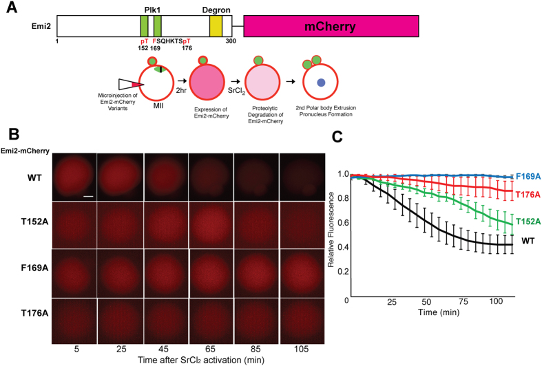 Figure 3. Testing the interactions of Emi2 with Plk1 based on Emi2 degradation after pathernogenetic activation of oocyte.(A)Scheme of Emi21–300-mCherry reporter constructs used in the study. It contains Plk1 binding sites and degron required by recognition of SCF-mediated ubiquitinylation. Thr152, Phe169 and Thr176 mutated as alanine are indicated as red. After in vitro transcriptions, cRNAs were injected into MII oocyte and subjected to SrCl2-mediated parthenogenetic activation and decrease of fluorescence from mCherry was monitored by time-lapse imaging of oocytes. (B) Time-lapse microscopy of parthenogenetically activated oocyte injected with Emi21–300-mCherry cRNAs. WT: wild type Emi21–300-mCherry cRNAs; T152A: site-directed mutant Emi21–300-mCherry containing Threonine152 to Alanine substitution; F169A: Phenylalanine169 to Alanine substitution; T176A: Threone176 to Alanine substitution; Representative figures of each groups corresponding 5, 25, 45, 65, 85 and 105 min after SrCl2 treatment were shown. (C) Quantification of fluorescence from oocyte injected with Emi21–300-mCherry cRNAs. Normalized fluorescence from oocytes injected with wild type (Black, n = 7), T152A (Green, n = 6), F169A (Blue, n = 4) and T176A (Red, n = 5) at each time points (5 min interval) were measured and average of each time points were plotted. Error bars indicate standard error of mean (S.E.M).