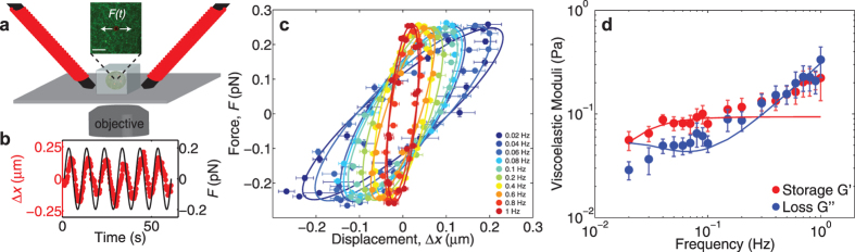 Figure 2. Nuclear actin forms a soft, viscoelastic network.(a) Schematic diagram of active microrheology experimental set-up with two opposing electromagnets. Inset shows XY image of Lifeact::GFP labeled actin network (green) with an embedded magnetic microsphere (red, R = 1.5 μm). Scale bar = 10 μm. (b) An example of sinusoidal applied force (black) and response of magnetic microsphere (red). (c) Lissajous (stress-strain) plot of applied magnetic force as a function of measured displacement of microspheres in one nucleus. Error bars are s.e.m. Curves are fit to an ellipse and color denotes applied frequency. (d) Viscoelastic moduli, storage modulus (red) and loss modulus (blue), as a function of frequency in the untreated nucleus (n = 9 nuclei). Error bars represent s.e.m. Solid line is from fit determined by viscoelastic model in Fig. 3 inset.