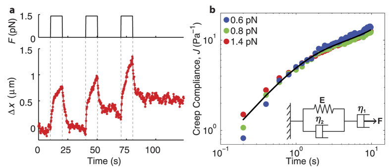 Figure 3. Nuclear actin undergoes creep under constantly applied stress.(a) Creep response for an individual bead at a force of 1.4 pN. Top shows applied force, and bottom shows displacement. (b) Averaged creep compliance as a function of time for different applied force (blue = 0.6 pN, green = 0.8 pN, and red = 1.4 pN) for the untreated nucleus, where n = 6, 4, and 7 nuclei, respectively. Black line represents fit for combined data based on viscoelastic model. Inset shows schematic of extended Kelvin-Voigt model.