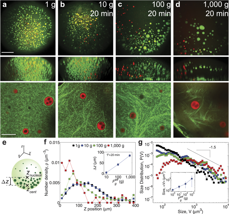 Figure 4. Centrifugation changes nuclear body spatial and size distributions in a force dependent manner.(a–d) Top images are maximum intensity XY projections of the entire nucleus containing nucleoli labeled with NPM1::GFP (green) and HLBs labeled with TagRFP::coilin (red); middle images are maximum intensity XZ projections of the same nucleus; and bottom images are XY views of the Lifeact::GFP labeled actin network with NPM1::RFP labeled nucleoli. For top and middle rows, scale bar = 100 μm, and for bottom row, scale bar = 20 μm. (a) The untreated nucleus contains suspended nuclear bodies at 1 g. For (b–d), the nucleus was centrifuged at 10 g (n = 21 nuclei), 100 g (n = 22 nuclei), or 1,000 g (n = 15 nuclei), for twenty minutes, respectively and nuclear bodies and nuclear actin were subsequently imaged. (e) Schematic illustrating relative displacement, Δz, between the average center of the nucleolar distribution in the native nucleus, , and the average center of the nucleolar distribution after centrifugation, . (f) The normalized number density, as a function of vertical -position of nucleoli, where the lowest -position, = 0, corresponds to the bottom of the nucleus for untreated nuclei (black) and nuclei centrifuged at 10 g (blue), 100 g (green), and 1,000 g (red) for twenty minutes. Inset shows the relative sedimentation displacement, Δz, as a function of the applied gravitational force. Error bars represent s.e.m. (g) The normalized probability distribution of nucleolus size (volume) for untreated nuclei (black) and nuclei centrifuged at 10 g (blue), 100 g (green), and 1,000 g (red) for twenty minutes. Solid line shows a slope of −1.5, indicative of power-law observed in native nuclei. Inset shows the average size of nucleoli vs. applied gravitational force. Error bars represent s.e.m.