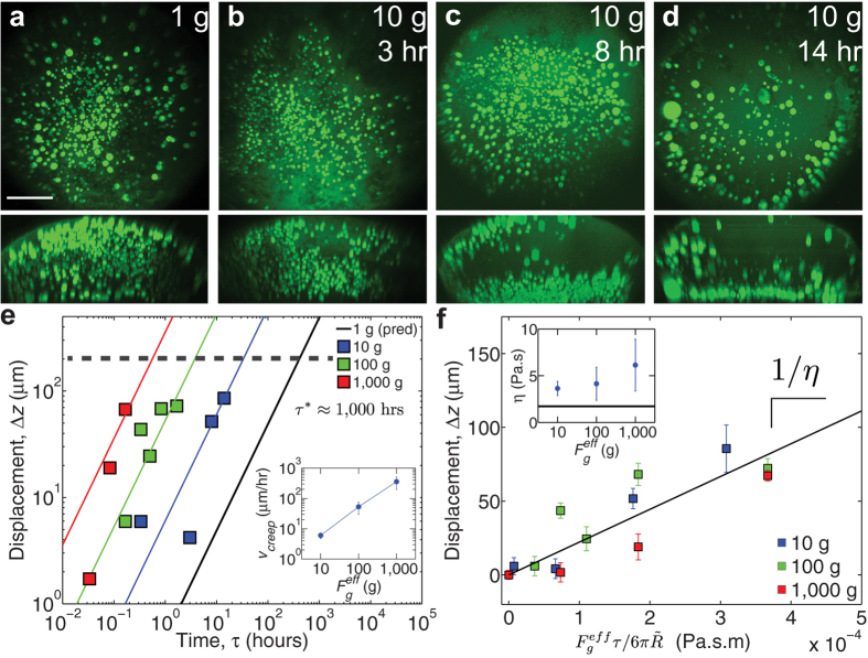 Figure 5. Spatial distributions evolve in time, consistent with creep behavior.(a–d) Top images are maximum intensity XY projections of the entire nucleus containing nucleoli labeled with NPM1::GFP (green); bottom images are maximum intensity XZ projections of same nuclei. Scale bar = 100 μm. (a) The untreated nucleus at 1 g. For (b–d), the nucleus was centrifuged at 10 g for 3 hours (n = 14 nuclei), 8 hours (n = 9 nuclei), and 14 hours (n = 9 nuclei), respectively. (e) The relative sedimentation displacement, Δz, as a function of centrifugation time at centrifugation forces of 10 g (blue), 100 g (green), and 1,000 g (red). Error bars represent s.e.m. Black solid line presents prediction at 1 g using Stokes law and average viscosity determined from centrifugation experiments. Dashed line represents a distance of 200 μm, representing the radius of the nucleus. Inset shows the creep velocity as function of effective gravitational force for 10 g, 100 g and 1,000 g. Error bars represent 95% confidence interval from the fit. (f) The relative sedimentation displacement, Δz, as a function of the scaled force for centrifugation forces of 10 g (blue), 100 g (green), and 1,000 g (red). Error bars represent s.e.m. Black solid line is the best-fit line for the data, and the slope is the inverse of the viscosity. Inset shows the viscosity individually determined for effective gravitational forces with error bars representing 95% confidence interval. Black solid line indicates the viscosity determined from the creep compliance fit by the viscoelastic model (Fig. 3b).