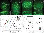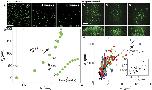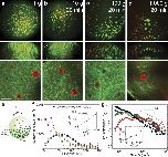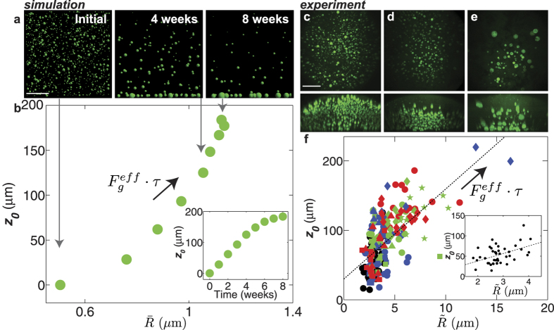 Figure 6. Signatures of aging due to gravitational creep.(a) Brownian dynamics simulation results (XZ plane) of gravitational creep over time. Scale bar = 100 μm. (b) The correlation between the distance, of the nucleoli from the center of the simulation box compared to the mean nucleolar size. Inset shows the distance, of the simulated nuclear bodies from (a) as a function of time. (c–e) Top images are maximum intensity XY projections of the entire (untreated) nucleus containing nucleoli labeled with NPM1::GFP (green); bottom images are maximum intensity XZ projections. Scale bar = 100 μm. From left to right, the spatial asymmetry of nuclear bodies becomes more pronounced and the average size of nuclear bodies increases. (f) The distance, of the center of the nucleolar distribution from the center of the nucleus compared to the median nucleolar size for all the centrifugation data combined; dashed black line is the best-fit line (correlation coefficient, ρ = 0.67). Arrow points in the direction of increasing effective force, , and/or centrifugation time, . Inset shows the correlation between the distance, and median nucleolar size for only the native data; dashed black line is the best-fit line (correlation coefficient, ρ = 0.46). Symbols are: native 1 g (black circles, n = 43 nuclei), 10 g 20 min (blue circles, n = 21 nuclei), 10 g 3 h (blue squares, n = 14 nuclei), 10 g 8 h (blue triangles, n = 9 nuclei), 10 g 14 h (blue diamonds, n = 9 nuclei), 100 g 10 min (green squares, n = 9 nuclei), 100 g 20 min (green circles, n = 22 nuclei), 100 g 30 min (green triangles, n = 9 nuclei), 100 g 50 min (green diamonds, n = 9 nuclei), 100 g 100 min (green pentagons, n = 12 nuclei), 1,000 g 2 min (red squares, n = 11 nuclei), 1,000 g 5 min (red triangles, n = 11 nuclei), 1,000 g 10 min (red diamonds, n = 11 nuclei), and 1,000 g 20 min (red circles, n = 15 nuclei).