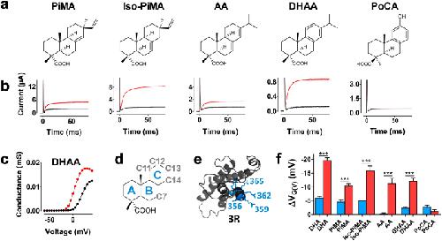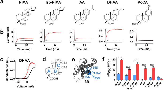 Figure 1. The effect of several natural resin acids on the opening of the Shaker K channel.(a) Molecular structure (from left to right) for pimaric acid (PiMA) (1), isopimaric acid (Iso-PiMA) (2), abietic acid (AA) (3), dehydroabietic acid (DHAA) (4), and podocarpic acid (PoCA) (5). (b) Representative current traces for voltages corresponding to 10% of maximum conductance in control solution at pH 7.4 of the 3R Shaker K channel. Black traces indicate control, and red traces 100 μM compound (same order as in a). (c) Representative G(V) curves for DHAA effects, same cell as in b (control, black symbols; DHAA, red symbols. ∆VG(V) = −15.5. (d) Ring nomenclature of the general compound skeleton (blue) and modified carbons in derivates (grey). (e) Gating charge residues (362 = R1, and 365 = R2) and mutated residues (shown as R) of the 3R Shaker K channel (359R, and 356R) are marked on one VSD of the Shaker K channel in the active state. (f) Compound-induced G(V) shifts for the WT (blue) and 3R Shaker K channel (red). Mean ± SEM (n = 9, 15, 15, 6, 4, 4, 5, 5, 10, 6, 4, and 6 from left to right). Data for DHA (6) and PiMA (1) are from ref 17. The shifts of WT and 3R Shaker K channel are compared for each compound (one-way ANOVA together with Bonferroni’s multiple comparison test: *P < 0.05; ***P < 0.0001).