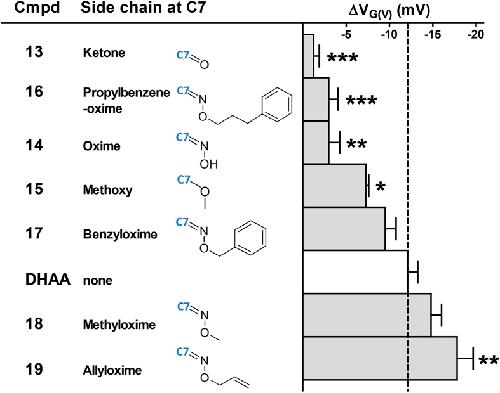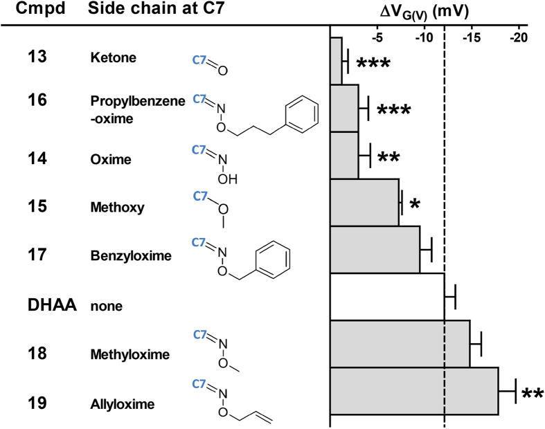 Figure 2. The effect of modifications of C7 at the B-ring for the activation of the 3R Shaker K channel.Chemical side chain and molecular structure for the introduced side chain at C7 of DHAA (4) (middle) for the specific compound (left). Compound(100 μM)-induced G(V) shifts for the 3R Shaker K channel (right). The dashed line equals the DHAA-induced shift. Mean ± SEM (n = 4–6). The shifts are compared with DHAA (4) (one-way ANOVA together with Dunnett’s multiple comparison test: *P < 0.05; **P < 0.01; ***P < 0.001).