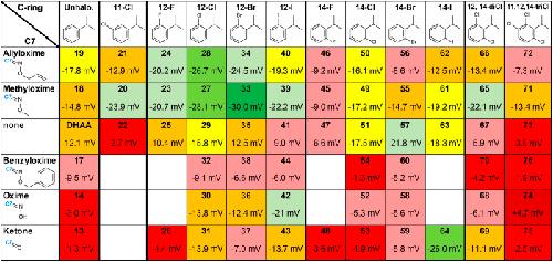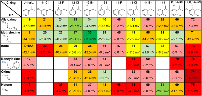 Figure 3. Halogenation-dependent potency.Shift of G(V) (mean values) by the unhalogenated and halogenated DHAA (4) derivates (100 μM), arranged according to halogenation of the C-ring (horizontal) and side chains attached to C7 (vertical). Compounds are color coded according to their potency: dark green: ∆VG(V) ≤ −30.0 mV, green: −30.0 mV < ∆VG(V) ≤ −25.0 mV, light green: −25.0 mV < ∆VG(V) ≤ −20.0 mV, yellow: −20.0 mV < ∆VG(V) ≤ −15.0 mV, orange: −15.0 mV < ∆VG(V) ≤ −10.0 mV, light red: −10.0 mV < ∆VG(V) ≤ −5 mV, red: −5.0 mV < ∆VG(V) ≤ 0.0 mV, dark red: ∆VG(V) > +0.0 mV.