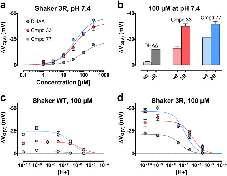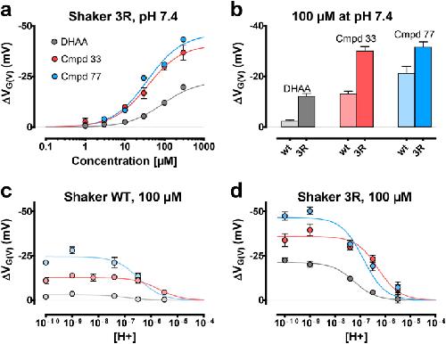 Figure 5. Concentration and pH dependent compound effects.(a) Concentration response curve for DHAA (4) (grey), Compound 33 (red), and Compound 77 (blue) at pH 7.4 for the 3R Shaker K channel. Error bars indicate SEM (n = 4–9). (b) Compound-induced G(V) shifts for the WT and 3R Shaker K channels. (c,d) pH dependence curves for WT (c) and 3R Shaker K channel (d) for 100 μM DHAA (4) (grey), 100 μM Compound 33 (red), and 100 μM Compound 77 (blue). Error bars indicate SEM (n = 4–9).