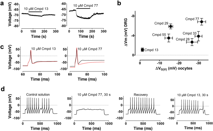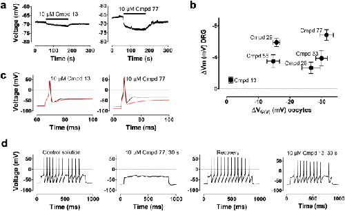 Figure 6. The effect of compounds on the resting membrane potential (Vm) and excitability of DRG neurons.(a) Recordings of Vm during application of Compound 13 and 77. (b) Compound-induced hyperpolarizing shifts of Vm of DRGs (10 μM at pH 7.4) plotted versus the shifts for the 3R Shaker K channel expressed in Xenopus oocytes (100 μM at pH 7.4). Mean ± SEM (for DRG-recordings, n = 4–7; for oocyte recordings, n = 4–9). (c) Effects on single action potentials by Compound 13 and 77 (black is control and red is test compound). (d) Effects on repetitive firing elicited by a continuous current pulse. The effect of Compound 77 is clearly reversible. Compound 13 had almost no effect.