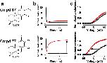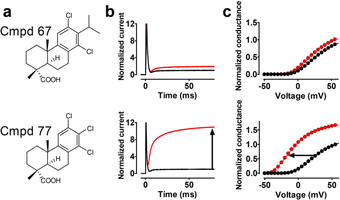 Figure 4. Replacement of the isopropyl group at C13 with a chlorine.(a) Molecular structure for Compound 67 (upper) and Compound 77 (lower). (b) Representative current traces for voltages corresponding to 10% of maximum conductance in control solution at pH 7.4 of the 3R Shaker K channel. Black traces indicate control, and red traces 100 μM compound (upper, Compound 67; lower, Compound 77). (c) Representative G(V) curves. Same cells as in b (control, black symbols; compound, red symbols. ∆VG(V) = −6.1 mV by Compound 67 (upper), and −32.6 mV by Compound 77 (lower) in these examples.