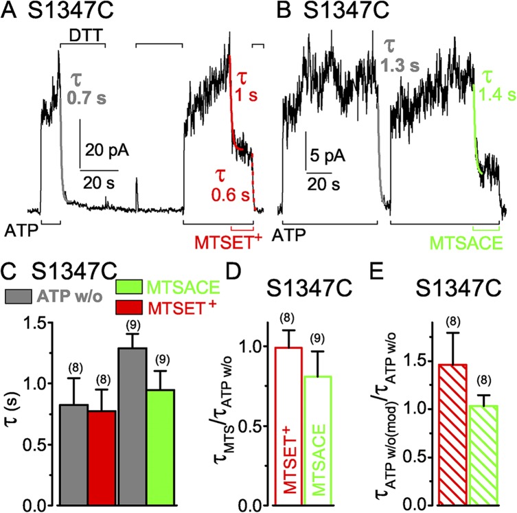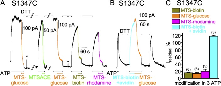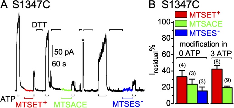 Cystic fibrosis transmembrane conductance regulator (CFTR) channel opening and closing are driven by cycles of adenosine triphosphate (ATP) binding-induced formation and hydrolysis-triggered disruption of a heterodimer of its cytoplasmic nucleotide-binding domains (NBDs). Although both composite sites enclosed within the heterodimer interface contain ATP in an open CFTR channel, ATP hydrolysis in the sole catalytically competent site causes channel closure. Opening of the NBD interface at that site then allows ADP-ATP exchange. But how frequently, and how far, the NBD surfaces separate at the other, inactive composite site remains unclear. We assessed separation at each composite site by monitoring access of nucleotide-sized hydrophilic, thiol-specific methanothiosulfonate (MTS) reagents to interfacial target cysteines introduced into either LSGGQ-like ATP-binding cassette signature sequence (replacing equivalent conserved serines: S549 and S1347). Covalent MTS-dependent modification of either cysteine while channels were kept closed by the absence of ATP impaired subsequent opening upon ATP readdition. Modification while channels were opening and closing in the presence of ATP caused macroscopic CFTR current to decline at the same speed as when the unmodified channels shut upon sudden ATP withdrawal. These results suggest that the target cysteines can be modified only in closed channels; that after modification the attached MTS adduct interferes with ATP-mediated opening; and that modification in the presence of ATP occurs rapidly once channels close, before they can reopen. This interpretation was corroborated by the finding that, for either cysteine target, the addition of the hydrolysis-impairing mutation K1250R (catalytic site Walker A Lys) similarly slowed, by an order of magnitude, channel closing on ATP removal and the speed of modification by MTS reagent in ATP. We conclude that, in every CFTR channel gating cycle, the NBD dimer interface separates simultaneously at both composite sites sufficiently to allow MTS reagents to access both signature-sequence serines. Relatively rapid modification of S1347C channels by larger reagents-MTS-glucose, MTS-biotin, and MTS-rhodamine-demonstrates that, at the noncatalytic composite site, this separation must exceed 8 Å.