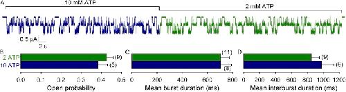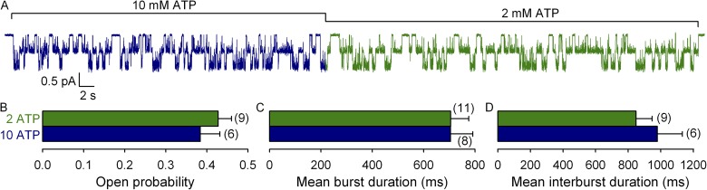 Figure 2. Steady-state mean burst duration of H1348A CFTR is insensitive to elevation of [ATP]. (A) Steady-state current recording from a patch containing two active H1348A CFTR channels gating in 2 mM (green segment) or 10 mM (dark blue segment) ATP. (B–D) Steady-state open probabilities (B), mean burst durations (C), and mean interburst durations (D) of H1348A CFTR in the presence of 2 mM (green bars) or 10 mM (dark blue bars) ATP, extracted from records with ≤5 active channels, as described in Materials and methods.