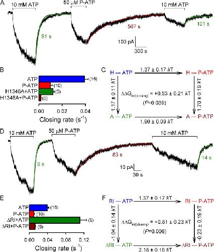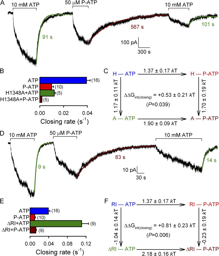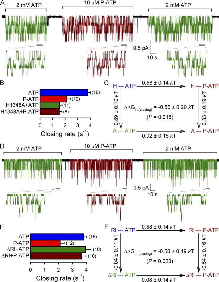 Figure 4. Mutation H1348A and deletion of segment 415–432 (ΔRI) abolish the effect of P-ATP on hydrolytic channel closure. (A and D) Steady-state recordings of single-channel currents in the presence of 2 mM ATP (green segments) or 10 µM P-ATP (brown segments) for H1348A (A) or ΔRI CFTR (D). Insets show at an expanded time scale 10-s intervals taken from the stable steady section of each segment (gray bars). In A, Vm was −40 mV. (B and E) Closing rates, obtained as the inverses of the steady-state mean burst duration, for H1348A (B) and ΔRI (E) CFTR channels gating in ATP (green bars) or P-ATP (brown bars). Steady-state closing rates of WT CFTR in ATP (blue bars) and P-ATP (red bars) were extracted from the data shown in Fig. 1 F. (C and F) Thermodynamic mutant cycles built on (hydrolytic) closing rates for the interaction of the P-ATP P group with residue 1348 (C) or the RI region (F). Each corner is represented by the particular site-1 protein structure (H or A at position 1348 [C]; maintained or deleted RI [F]) and the nucleotide driving gating (ATP or P-ATP), respectively. ΔΔG‡ values (mean ± SEM) on arrows show perturbation-induced changes in the stability of the closing transition state with respect to the open ground state and were used to calculate (see Materials and methods) the coupling energy for the P group–1348 (C) and the P group–RI (F) interaction (ΔΔGint(closing)).