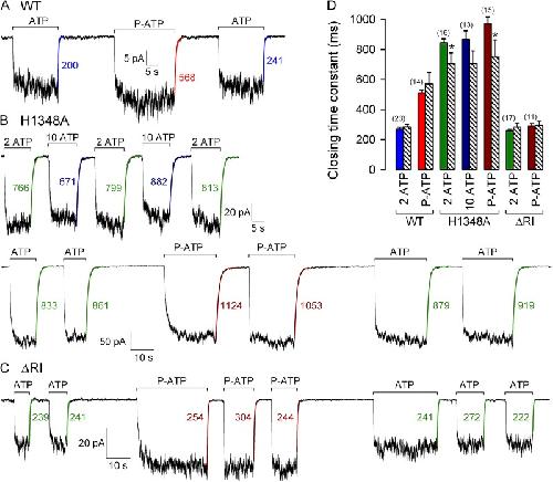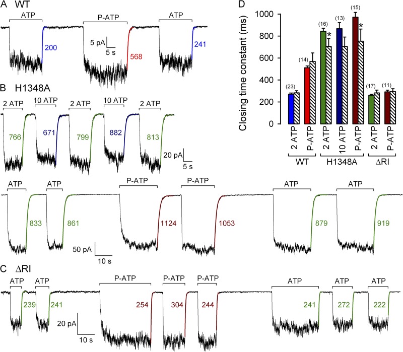 Figure 6. Relaxation time courses of macroscopic WT, H1348A, and ΔRI CFTR currents upon sudden nucleotide removal. (A–C) Macroscopic currents of prephosphorylated WT (A), H1348A (B), and ΔRI (C) CFTR channels elicited by exposure (bars) to either 2 mM ATP alternating with 10 µM P-ATP (A and C), or 2 mM ATP alternating with either 10 mM ATP (B, top) or 10 µM P-ATP (B, bottom). Current decay time courses upon sudden removal of the nucleotide were fitted with single exponentials (colored solid lines); colored numbers are time constants (in milliseconds). (D) Closing time constants of WT CFTR currents upon removal of 2 mM ATP (blue bar) or 10 µM P-ATP (red bar), of H1348A CFTR currents upon removal of 2 (left green bar) or 10 mM ATP (dark blue bar) or 10 µM P-ATP (left brown bar), and of ΔRI CFTR currents upon removal of 2 mM ATP (right green bar) or 10 µM P-ATP (right brown bar). As a comparison, striped bars replot mean burst durations of the respective constructs measured at steady state in the presence of the respective nucleotide (from Figs. 1 F, 2 C, and 4, B and E).