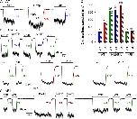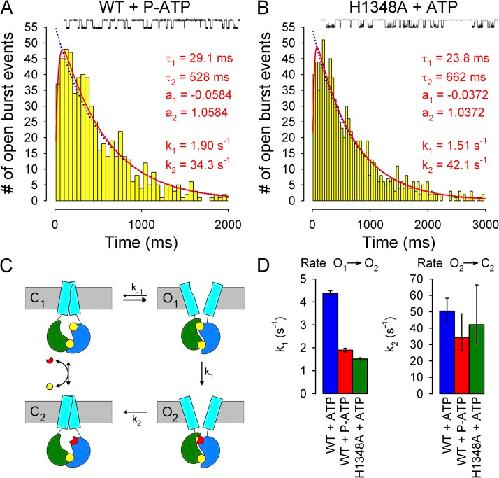 Figure 7. P-ATP and the H1348A mutation slow the O1→O2 transition of CFTR channels. (A and B) Histograms of open burst durations compiled from 621 open burst events of single WT CFTR channels gating in 10 µM P-ATP (A) and from 908 open burst events of single H1348A CFTR channels gating in 2 mM ATP (B). Both distributions were fitted by maximum likelihood to either a single exponential (blue dotted lines) or to the scheme in C, with rate k-1 fixed to zero (red lines); the latter fits proved significantly (P < 0.01 for A and P ≈ 0.05 for B) better by the log-likelihood ratio test. Fit parameters, as well as calculated time constants and fractional amplitudes of the exponential components of the fitted distributions, are plotted in both panels. (Insets) 30-s segments of single-channel recordings. (C) Simplified cyclic gating scheme (from Csanády et al., 2010) used for maximum likelihood fitting of open burst distributions, depicting closed and open states with either ATP (states C1 and O1) or ADP (states C2 and O2) bound at site 2. Pore opening/closure is assumed quasi-simultaneous with formation/disruption of the NBD dimer. Cyan rectangles, TMDs; green, NBD1; blue, NBD2; yellow, ATP; red, ADP. (D) Summary of rates k1 and k2 obtained from the fits in A and B for WT CFTR gating in 10 µM P-ATP (red bars) and H1348A CFTR gating in 2 mM ATP (green bars); as a comparison, the values measured for WT CFTR gating in 2 mM ATP (blue bars) are replotted from Csanády et al. (2010). Error bars represent 0.5-unit log-likelihood intervals. Note that in the presence of the site-1 perturbations, rate k2 could be estimated only to a limited precision because of the increased discrepancy between the values of k1 and k2 (compare Csanády, 2006; k2/k1 is 11, 18, and 29, respectively, for WT+ATP, WT+P-ATP, and H1348A+ATP).