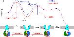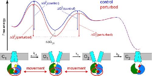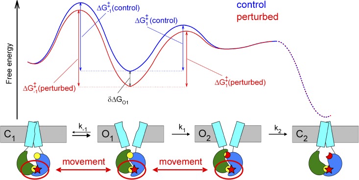 Figure 8. Energetic interpretation of the gating effects of P-ATP and the H1348A mutation. Free energy profiles (top; not drawn to scale) of channels moving sequentially through the gating states depicted below (from Fig. 7 C), in the absence (blue energy profile) or presence (red energy profile) of a perturbation (red star in cartooned states) in composite site 1. A selective stabilization of the O1 ground state (by δΔGO1, relative to both C1 and O2) is predicted to increase the heights of the free energy barriers for exiting O1 in both directions (ΔG‡-1 and ΔG‡1; compare red and blue vertical double arrows), thereby slowing both rate k-1 and k1 (cartoon).