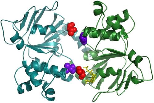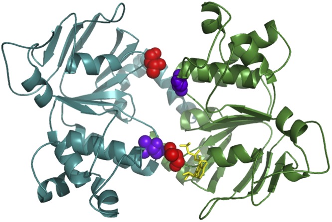 Figure 9. Partial separation of degenerate site in an asymmetrical bacterial ABC exporter. Ribbon diagram of NBD dimer from the crystal structure of TM287/288 (Protein Data Bank accession no. 3QF4), with AMPPNP (yellow) bound at the degenerate site. Conserved Walker A threonines (T368 in TM287 and T390 in TM288; red), as well as D-loop residue N521 of TM288 and corresponding TM287 residue S499 (violet), are highlighted in space fill. The empty active site is wide open, whereas the nucleotide-bound degenerate site retains some contact between the two NBD surfaces through opposing Walker A and D-loop motifs. NBD color coding follows that used in Fig. 7 C: green, TM287; blue, TM288.