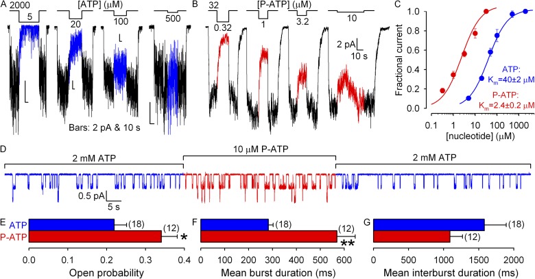 Figure 1. Effects of P-ATP on rough channel gating parameters of WT CFTR. (A and B) Macroscopic currents of prephosphorylated CFTR channels elicited by step applications (bars) of various concentrations of ATP (A) or P-ATP (B). (C) Dose–response curves for current stimulation by ATP (blue symbols) and P-ATP (red symbols). Mean steady currents in the presence of test nucleotide concentrations were normalized to the average of those measured in bracketing segments in the presence of 2 mM (ATP) or 32 µM (P-ATP) nucleotide. Fits to the Michaelis–Menten equation (solid lines) yielded Km values shown. (D) Steady-state current recording from a patch containing two active WT CFTR channels gating in 2 mM ATP (blue segments) or 10 µM P-ATP (red segment). (E–G) Steady-state open probabilities (E), mean burst durations (F), and mean interburst durations (G) of WT CFTR in the presence of 2 mM ATP (blue bars) or 10 µM P-ATP (red bars), extracted from records with ≤2 active channels, as described in Materials and methods.