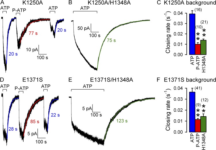 Figure 3. P-ATP and the H1348A mutation slow nonhydrolytic CFTR closure. (A and D) Macroscopic currents of prephosphorylated K1250A (A) and E1371S (D) CFTR channels elicited by exposure (bars) to either 10 mM ATP alternating with 50 µM P-ATP (A) or 2 mM ATP alternating with 10 µM P-ATP (D); the fivefold higher nucleotide concentrations for the K1250A constructs were used to compensate for the large decrease in apparent ATP affinity caused by this mutation (Vergani et al., 2003). Current decay time courses after sudden removal of the nucleotide were fitted with single exponentials (colored solid lines); colored numbers are time constants (in milliseconds), which reflect mean burst durations. (B and E) Macroscopic currents of prephosphorylated K1250A/H1348A (B) and E1371S/H1348A (E) CFTR channels elicited by transient exposure (bars) to either 10 mM (B) or 2 mM (E) ATP. Current decay time courses after sudden ATP removal were fitted with double exponentials (colored solid lines); colored numbers are calculated average burst durations (τ*, in milliseconds; see Materials and methods). The fit parameters were τ1 = 37 s, τ2 = 165 s, A1 = 0.34, and A2 = 0.66 for B, and τ1 = 24 s, τ2 = 179 s, A1 = 0.07, and A2 = 0.93 for E. (C and F) Nonhydrolytic closing rates of channels opened by ATP (blue bars) or P-ATP (red bars), or of channels bearing the H1348A mutation opened by ATP (green bars), measured in the K1250A (C) or E1371S (F) background. Closing rates were calculated as the inverse of the decay time constant after nucleotide removal; for traces that were not well fit by a single exponential, the average closing rate was calculated as 1/τ*.