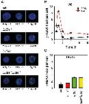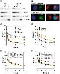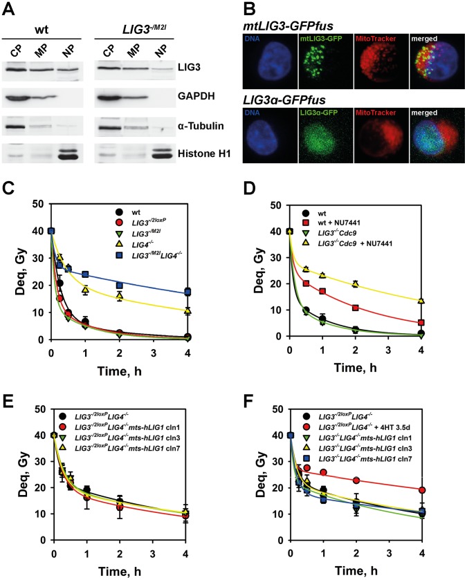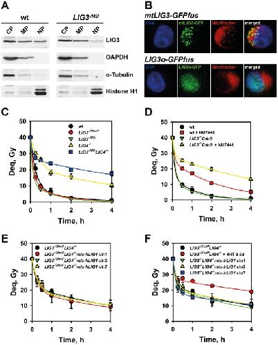 Figure 4. Deletion of nuclear LIG3 reveals a function for LIG1 in the processing of IR-induced DSBs.(A) Western blot analysis of LIG3 protein in the cytosolic fraction (CP), the mitochondria fraction (MP) and the nuclear fraction (NP) of wt and LIG3â/M2I cells. GAPDH, α-Tubulin, and histone H1 are fractionation- and loading-controls. (B) Subcellular localization studies by live cell imaging using mtLIG3-GFP fusion protein to follow the intracellular distribution mtLIG3 and MitoTracker Deep Red to visualize the mitochondria. Cell nuclei were counterstained with Hoechst 33342. Note the colocalization between GFP and Deep Red that indicates the localization of mtLIG3 in the mitochondria. (C) Kinetics of DSB repair in wt, LIG3â/2loxP, LIG3â/M2I, LIG4â/â and LIG3â/M2ILIG4â/â after exposure to 40 Gy X-rays. Results from at least two independent experiments with 4 samples each were used to calculate the indicated means and standard errors. Other details are as in Fig. 1B. (D) Kinetics of DSB repair in wt and LIG3â/âCdc9 cells measured in the presence or absence of 10 µM NU7441, a DNA-PKcs specific inhibitor. This LIG3â/â mutant is viable as a result of the expression of the yeast homolog of LIG1, Cdc9 [18]. Other details are as in C. (E) Kinetics of DSB repair in asynchronous LIG3â/2loxPLIG4â/â and clones 1, 3 and 7 of LIG3â/2loxPLIG4â/âmts-hLig1 cells. Other details are as in C. (F) Kinetics of DSB repair in asynchronous LIG3â/2loxPLIG4â/â, clones 1, 3 and 7 of LIG3â/âLig4â/âmts-hLig1 cells and of LIG3â/2loxPLIG4â/â3.5 days after 4HT treatment, respectively. Other details are as in C.