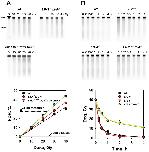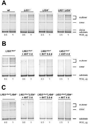 Figure 5. Dominant contribution of LIG3 in-vitro end joining.(A) Representative gels of in vitro DNA end joining of Sal I linearized pSP65 plasmid using whole cell extracts of asynchronous wt, LIG1−/−, LIG4−/−, and LIG1−/−LIG4−/− cells. The linearized input substrate (linear) and the rejoined products (circles, dimers and multimers) generated by end joining are indicated (B) As in A. for LIG3−/2loxP cells after treatment with 4HT for the indicated periods of time. (C) As in A. for LIG3−/2loxPLIG4−/− cells after treatment with 4HT for the indicated periods of time.